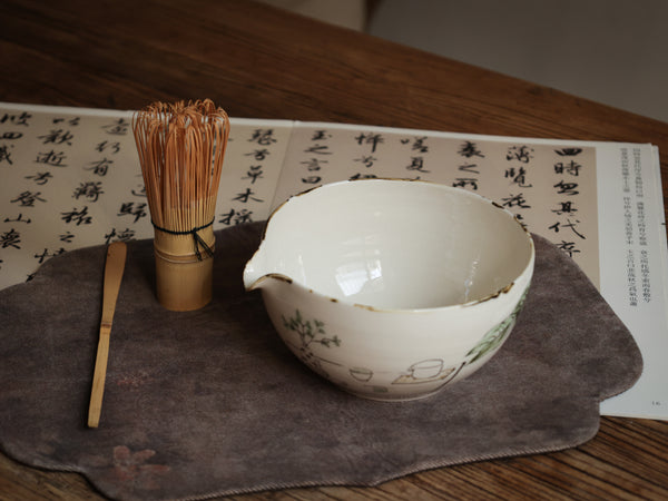 Feature:Made of ceramic , the bowl appears refined and clean. It features a hand-painted scene of matcha ceremony.Dimension :L=14.5cm, W=13cm, H= 7.5cmArtist: Mupu (see here for more details of the artist).
